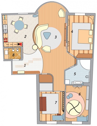 Перепланировка Холл приглашает в гостиную без дверей и перегородок. Кухня и гостиная объединены в студию. В основу открытой гостеприимной студио положена идея круга — полукруглой формы потолок, мебель с мягкими овальными формами, круглая колонна.